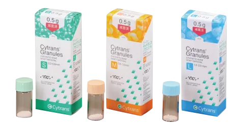 Cytrans® Granules are composed of carbonate apatite, which is same as the inorganic component of human bone. Cytrans® Granules are engineered, without using animal derived materials.