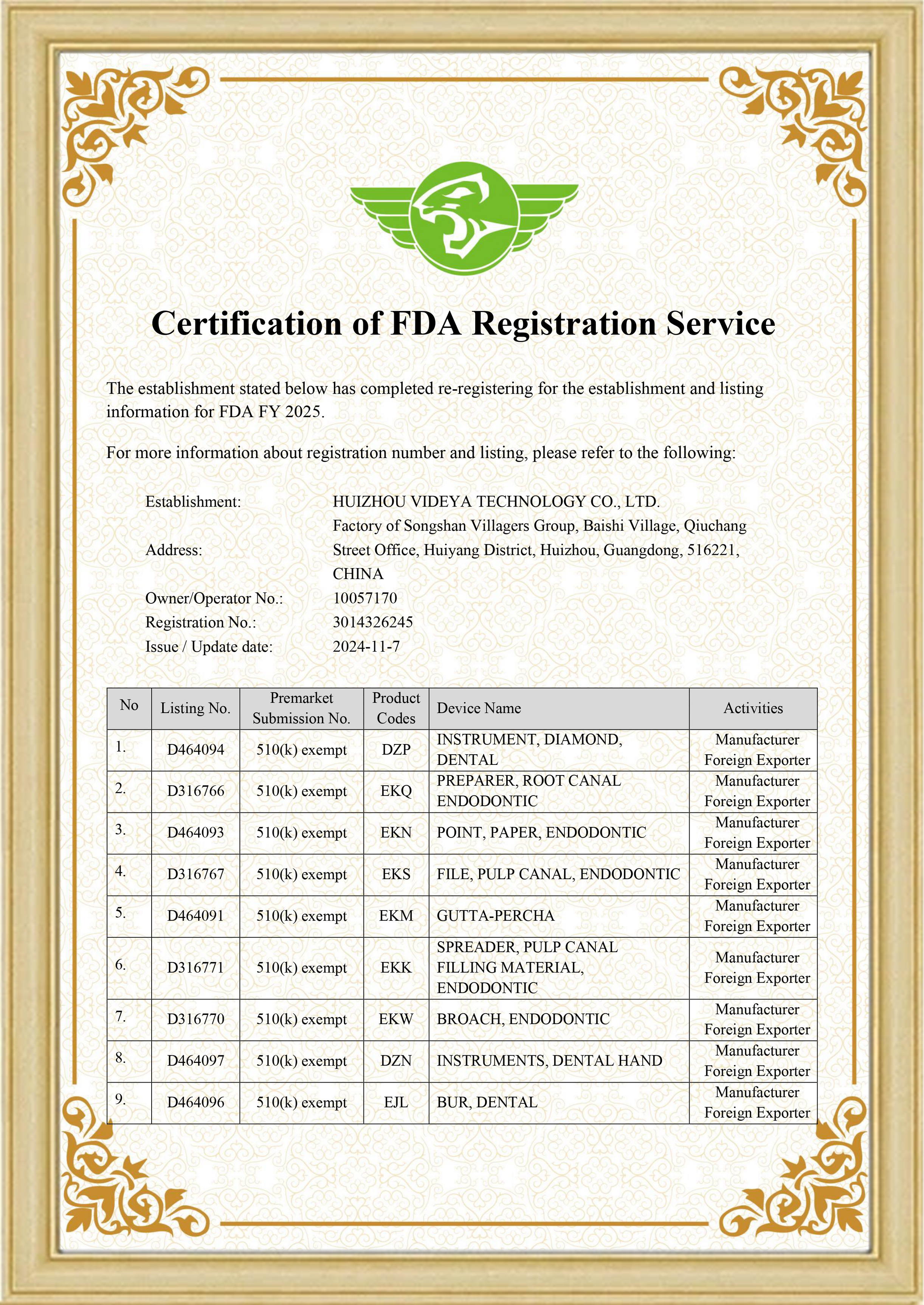 VIDEYA endo products have been registered by China Food and Drug Administration, and obtained ISO13485, CE0197 and FDA certificates approval by TUV.